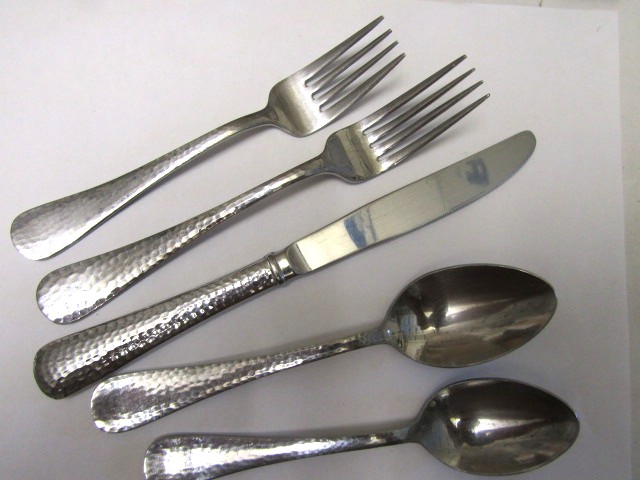 5-piece Place Setting includes one each: Solid Dinner Knife, Dinner Fork, Salad Fork, Teaspoon, Place / Soup Spoon.
