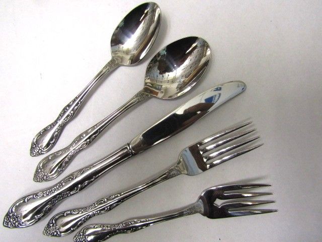 Piece: Five piece place setting. One each: 8 5/8" Dinner Knife, Dinner Fork, Salad Fork, Place/Oval Soup Spoon, and Teaspoon